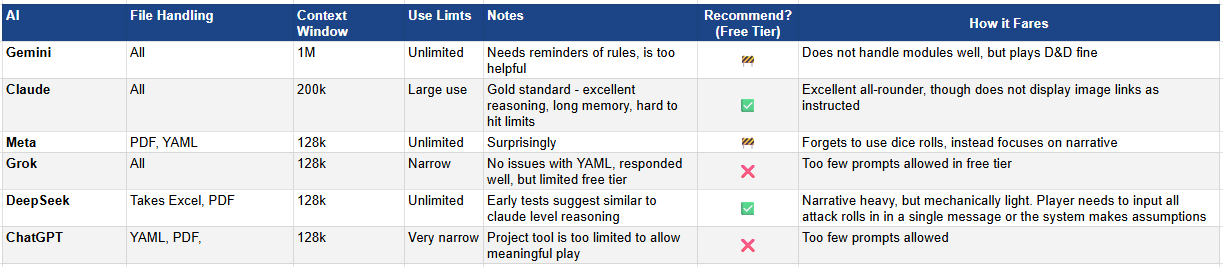 Gemini meanwhile played mechanically very well, but struggled to follow the story module correctly, and did not deliver plot-hooks correctly, according to the story module instructions. The system has a 1,000,000 token context limit that has so much promise for D&D, given the significant context window should in theory provide it with outstanding ability to play and run a D&D campaign with a relatively long memory. However the inability to “connect the dots” on modules made this difficult. We will test at a later date combining all three modules into a single document and see how it handles that.