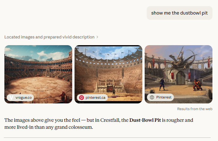 DeepSeek on the other hand, whilst not as mechanically proficient as Claude, handled narrative play perfectly well and gave links to Google Drive images without issues. DeepSeek was narratively immersive and wrote engaging character dialogue, set scenes up well, though combat was handled in a more narrative format with instant successes of every decision rather than rolling.